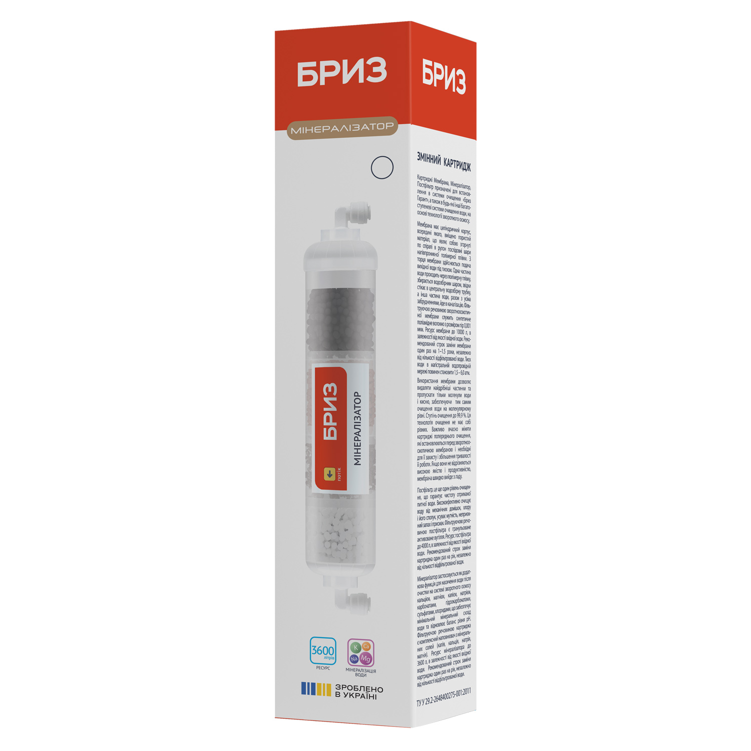 Картридж «Мінералізатор стандарт» призначений для установки в системи очищення води «Бриз Гарант», «Бриз Гарант Еко», а також в будь-які інші багатоступеневі системи очищення води на основі зворотного осмосу. Використовується для збагачення води оптимізованим набором корисних мікроелементів в об’ємі, який необхідний для приготування їжі і пиття. Картридж «Мінералізатор стандарт» володіє високою ємністю, хімічною і фізичною стабільністю. Застосовується як додаткова функція для насичення води після очистки на системі зворотного осмосу кальцієм, магнієм, калієм, натрієм, карбонатами, гідрокарбонатами, сульфатами, хлоридами, що забезпечує мінімальний мінеральний склад води та відновлює баланс рівня рН. Фільтруючою речовиною картриджа є комплексний наповнювач з мінеральних солей (калія, кальція, натрія, магнія).