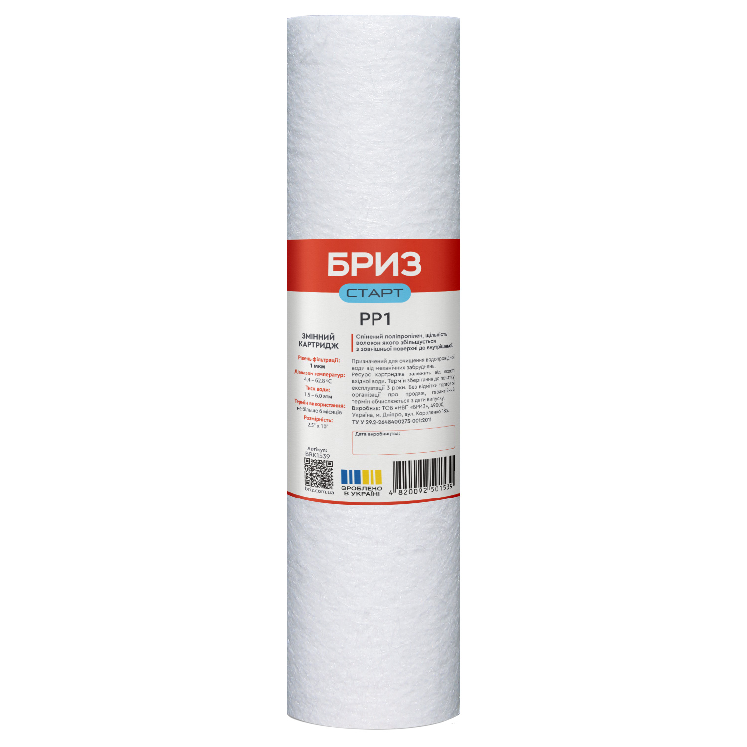 Картридж «Бриз Старт РР» призначений для установки в системи очищення води «Бриз Старт Стандарт», «Бриз Старт Оптима», а також в будь-які інші одно- і багатоступінчасті системи очищення води. Використовується для доочищення водопровідної води від механічних забруднень. Картридж «Бриз Старт РР» володіє високою ємністю, хімічною і фізичною стабільністю. Застосовується для видалення з води бруду, мулу, іржі, дрібних зважених часток розміром більше 1 мкм. Фільтруючою речовиною картриджа служить спінений поліпропілен, щільність волокон якого збільшується від зовнішньої поверхні до внутрішньої.